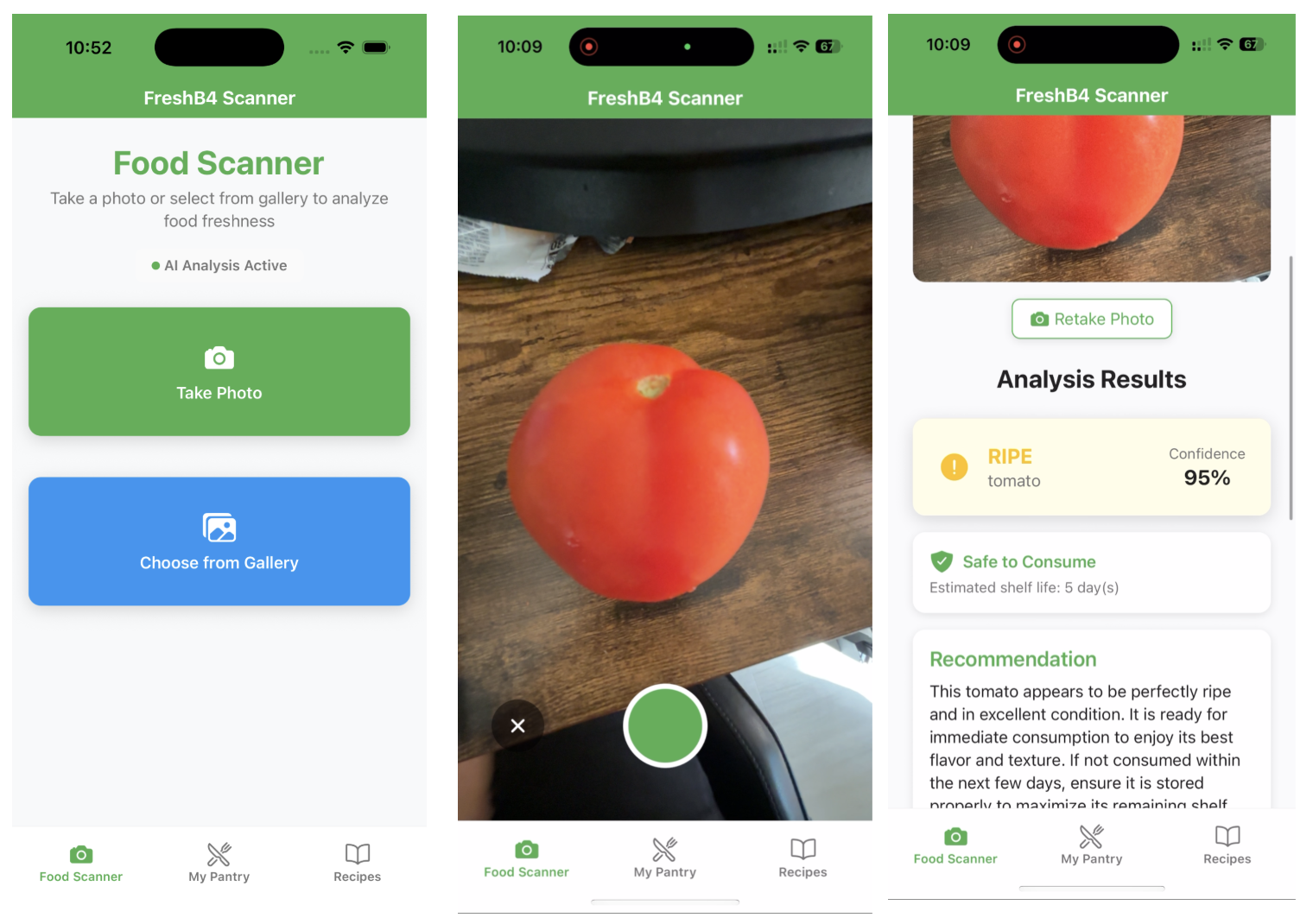React-native full stack mobile application that allows users to upload or capture picture, and view freshness analyses. Leveraged Gemini API to integrate an LLM in our app to perform the freshness analysis, give the user recommendations, and detailed recipes. Won "Best use of Gemini-API" award!